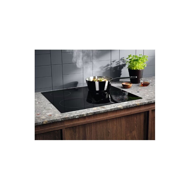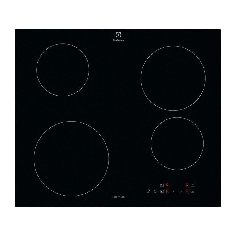 Indukcinė kaitlentė ELECTROLUX EIB60420CK su jutikline valdymo sistema – Juoda, nuožulnus dizainas, galios padidinimo funkcija, liekamasis šilumos indikatorius.