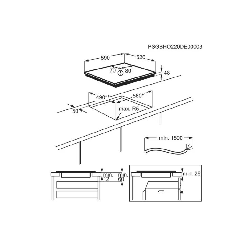 - Kairė galinė zona: Indukcinė, 1400/1500W, 145 mm