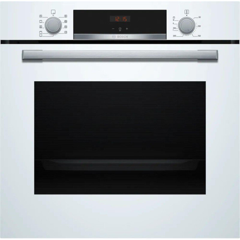 Bosch Serija 4, Įmontuojamoji orkaitė, 60 x 60 cm, balta HBA534BB3.\nŠi įmontuojama orkaitė yra puikus pasirinkimas tiems, kurie ieško patikimo, funkcionalaus ir stilingo prietaiso savo virtuvei. \nOrkaitė pasižymi moderniomis technologijomis, užtikrinančiomis puikius kepimo rezultatus.\nPagrindinės Savybės:\n3D Hotair: Tolygus šilumos paskirstymas orkaitės viduje, leidžiantis kepti iki trijų lygių vienu metu. \nŠi funkcija užtikrina, kad visi patiekalai bus iškepti tolygiai, nepriklausomai nuo jų padėties orkaitėje.\nEcoClean Direct: Speciali danga galinėje orkaitės sienelėje neleidžia kauptis nešvarumams, todėl orkaitę lengviau valyti.\nIššokančios valdymo rankenėlės: Orkaitės valdymo rankenėlės yra iššokančios, todėl ne tik patogu valdyti orkaitę, \nbet ir lengviau nuvalyti priekinę dalį. Be to, šios rankenėlės suteikia orkaitei modernią išvaizdą.\nRaudonos šviesos diodų ekranas: Lengvai matomas ekranas, kuriame rodomi laikmačiai, chronometras ir laikrodis, \nsuteikia patogumo naudojantis orkaite.\nNaudinga orkaitės talpa: 71 litras.\nŠildymo režimai: Didelio ploto grilis, kaitinimas iš apačios, karštas oras, picos lygmuo, švelnus \\\"Hotair\\\", \nventiliuojamas grilis, viršutinis/apatinis kaitinimas.\nTemperatūros reguliavimas: Mechaninis.\nMontavimo angos dydis (A x P x G): 585-595 x 560-568 x 550 mm.\nGaminio išmatavimai: 595 x 594 x 548 mm.\nEnergijos vartojimo efektyvumo klasė: A+.\nPrijungimo galia: 3400 W.\nIntegruoti priedai: \n1 x Kombinuotos grotelės.\n1 x Universali kepimo skarda.\nPapildomos Funkcijos:\nGreitas įkaitinimas: Orkaitė greitai įkaista iki norimos temperatūros, sutaupant laiką.\nElektroninis laikrodis: Patogus laikmatis su elektroniniu laikrodžiu.\nHalogeninis apšvietimas: Orkaitės viduje yra halogeninis apšvietimas, kuris užtikrina gerą matomumą.\nIntegruotas aušinimo ventiliatorius: Apsaugo orkaitę nuo perkaitimo.\nSaugi durelių temperatūra: Durelės neįkaista, todėl naudotis orkaite yra saugu.\nĮstiklintos CoolTouch durelės (3): Dėl šių durel