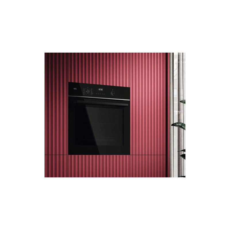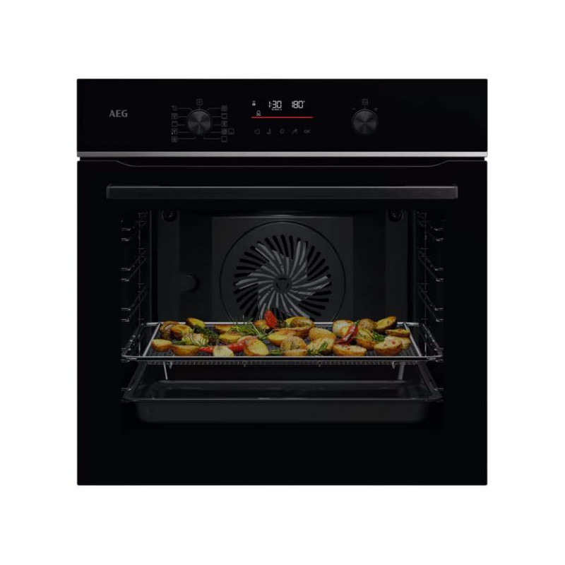 Juodos spalvos el.orkaitė su pirolize AEG TS6PB531AB 6000 "SenseCook" serijos orkaitė su pirolizės ir AirFry funkcija AEG TS6PB531AB Orkaitės talpa: 71 l Energijos klasė: A+ Valdymo skydelio paviršius: Metalinis rėmas su juodo stiklo apdaila viršuje Valdymas: Įspaudžiamos rankenėlės LED valdymo skydelis „EXPlore“ su sensoriniais mygtukais (5 jutikliniai valdymo mygtukai) Ekrano laikmačio spalva: balta Temperatūros valdymas: Elektroninis rankenėle Temperatūros diapazonas: 30°C - 300°C Funkcijos: 9 maisto gaminimo režimai + papildomas meniu Greito orkaitės įkaitinimo funkcija Maisto gaminimo vadovas „Assist“ (45 iš anksto nustatytos automatinės programos pagal svorį/mėsos termometro nustatymą/garus) Liekamosios šilumos indikacija Automatinis užraktas pirolizės metu Atidrant duris ventiliatorius nustoja suktis Valymo priminimas Pirolizė - galimi 3 intensyvumo lygiai (išsivalymas aukšta temperatūra) TR1LV teleskopiniai 1 lygio bėgeliai (padėtį galima keisti) Mėsos termometras Švelnus durelių uždarymas „SoftMotion™“ „AirFry“ funkcija - mėgaukitės gardžiomis bei traškiomis skrudintomis bulvytėmis arba daržovėmis su mažiau aliejaus. Pro groteles karštas oras gali nuolat cirkuliuoti po visą orkaitę, kad kaskart paruoštumėte tobulai traškų maistą. Kaskart tobulai trašku. „WiFi“ funkcija - orkaitė gali būti valdoma per „AEG App“ programėlę Apšvietimo lemputė Durelės su 4 stiklais Aušinimo ventiliatorius: orkaitė automatiškai aušina elektroninius komponentus ir korpusą, aušinimo ventiliatorius veikia tol, kol orkaitė atvėsta (apie 5-7 min.). Spalva: Juoda stiklo apdaila su plieno juostelės apdaila panelės apačioje Rankena: Juoda metalinė anoduota Komplektacijoje: 1 x chromuotos grotelės, 1 x kepimo skarda, 1 x AirFry perforuota skarda