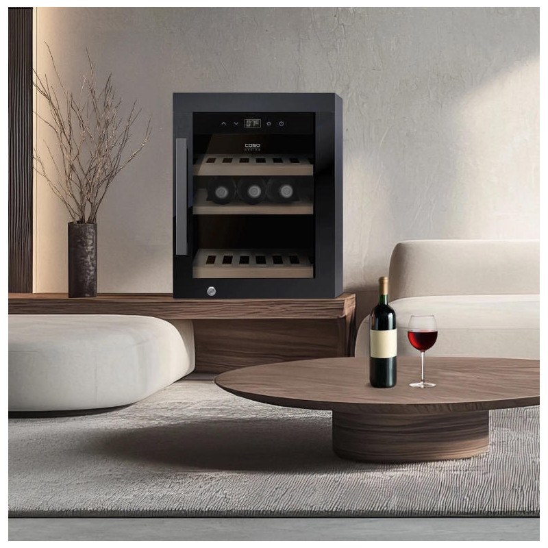 Caso WineExclusive 12 – kompaktiškas ir elegantiškas vyno šaldytuvas, skirtas iki 12 butelių laikymui idealiomis sąlygomis. Modernus juodos spalvos dizainas, nerūdijančio plieno ir stiklo apdaila bei UV filtrą turinčios durelės užtikrina tiek estetiką, tiek patikimą jūsų vyno apsaugą.